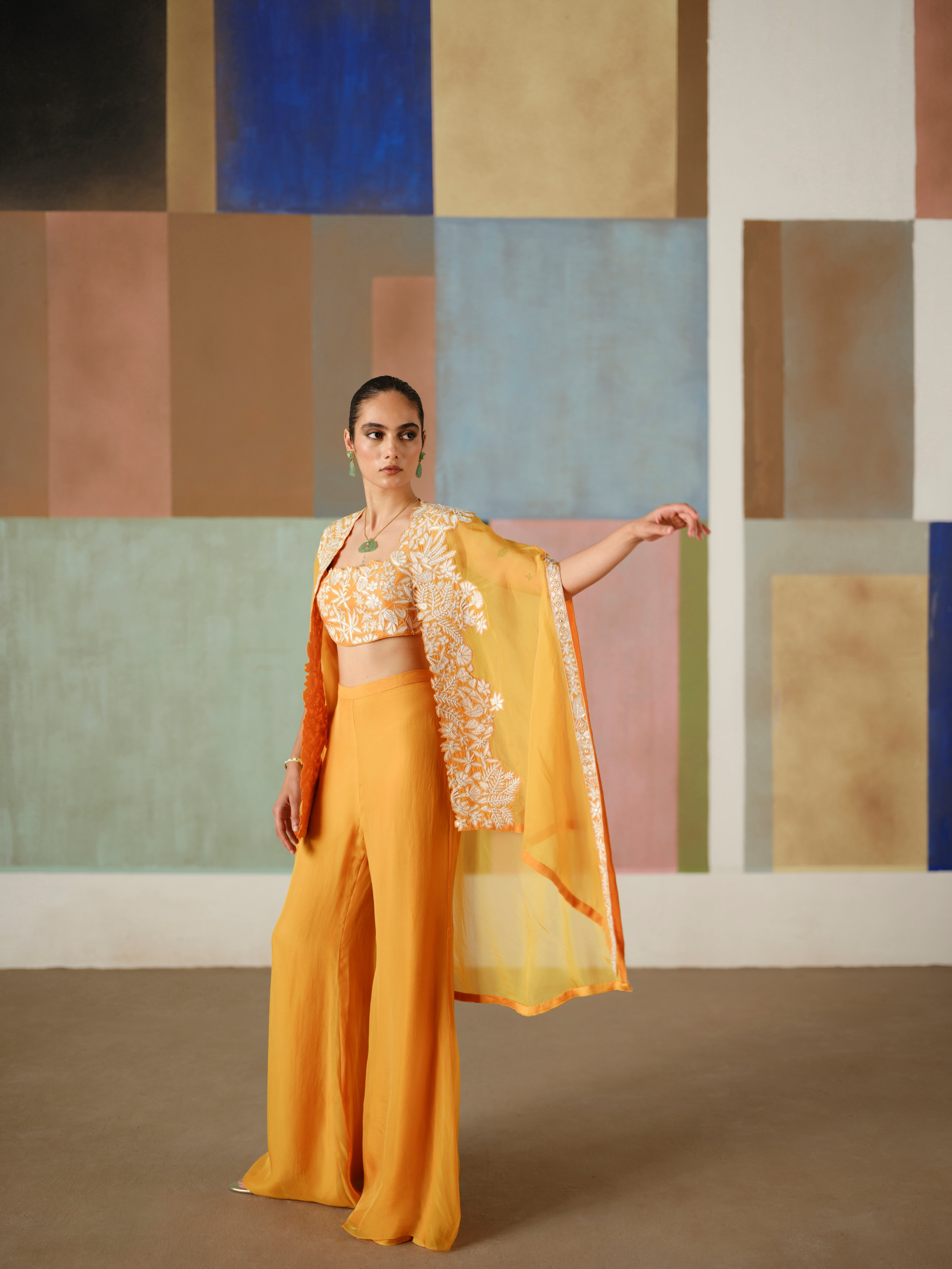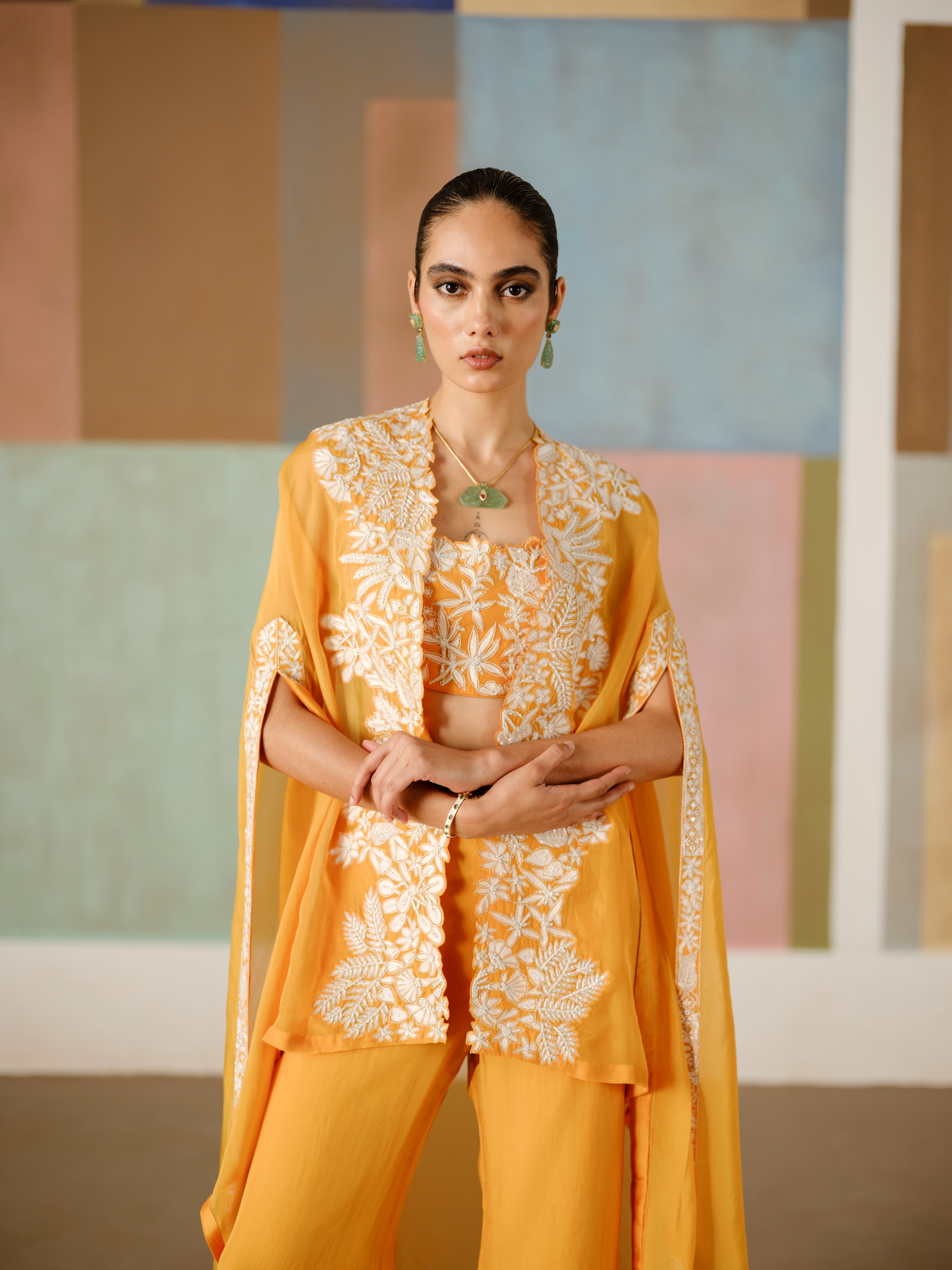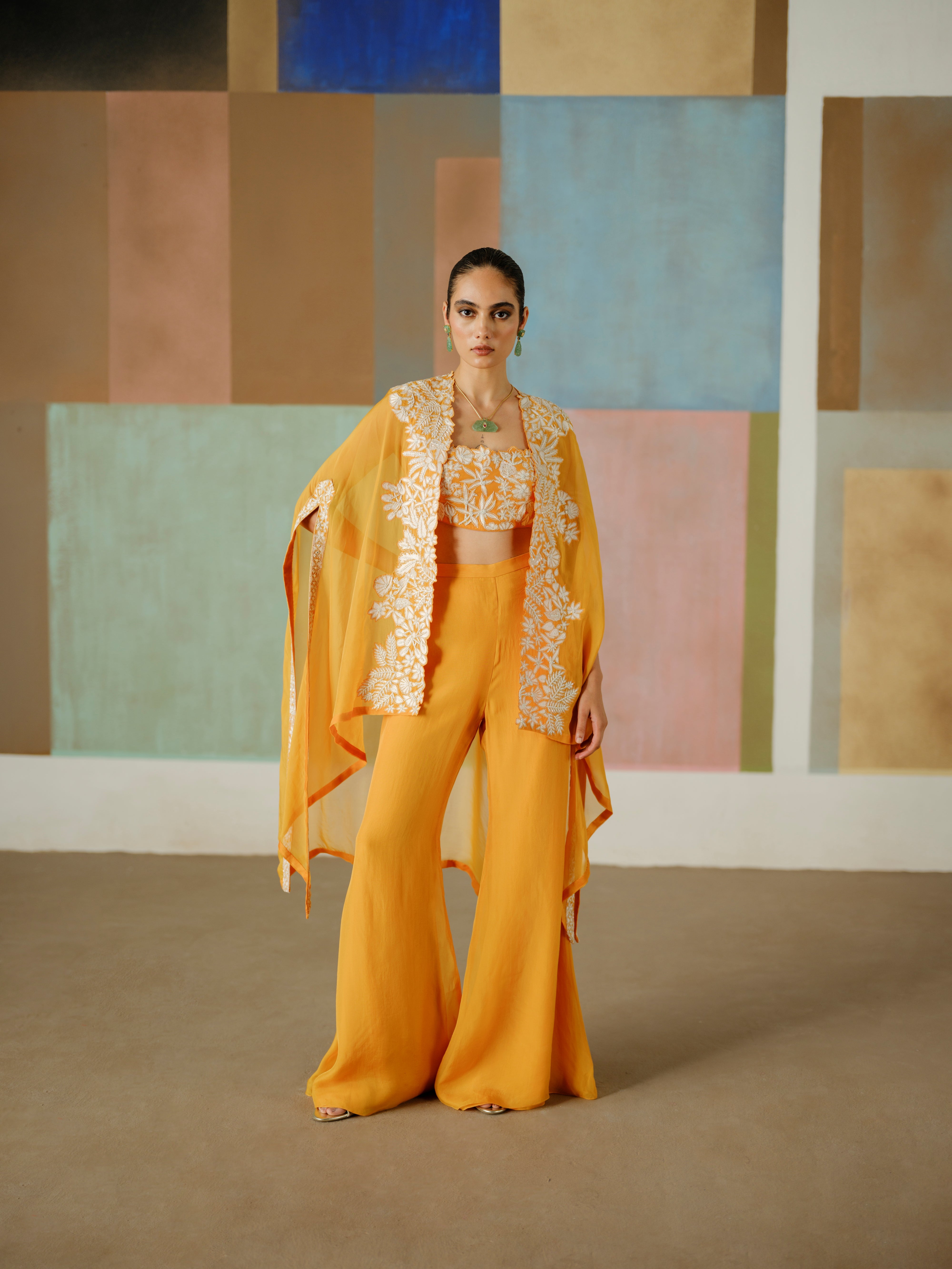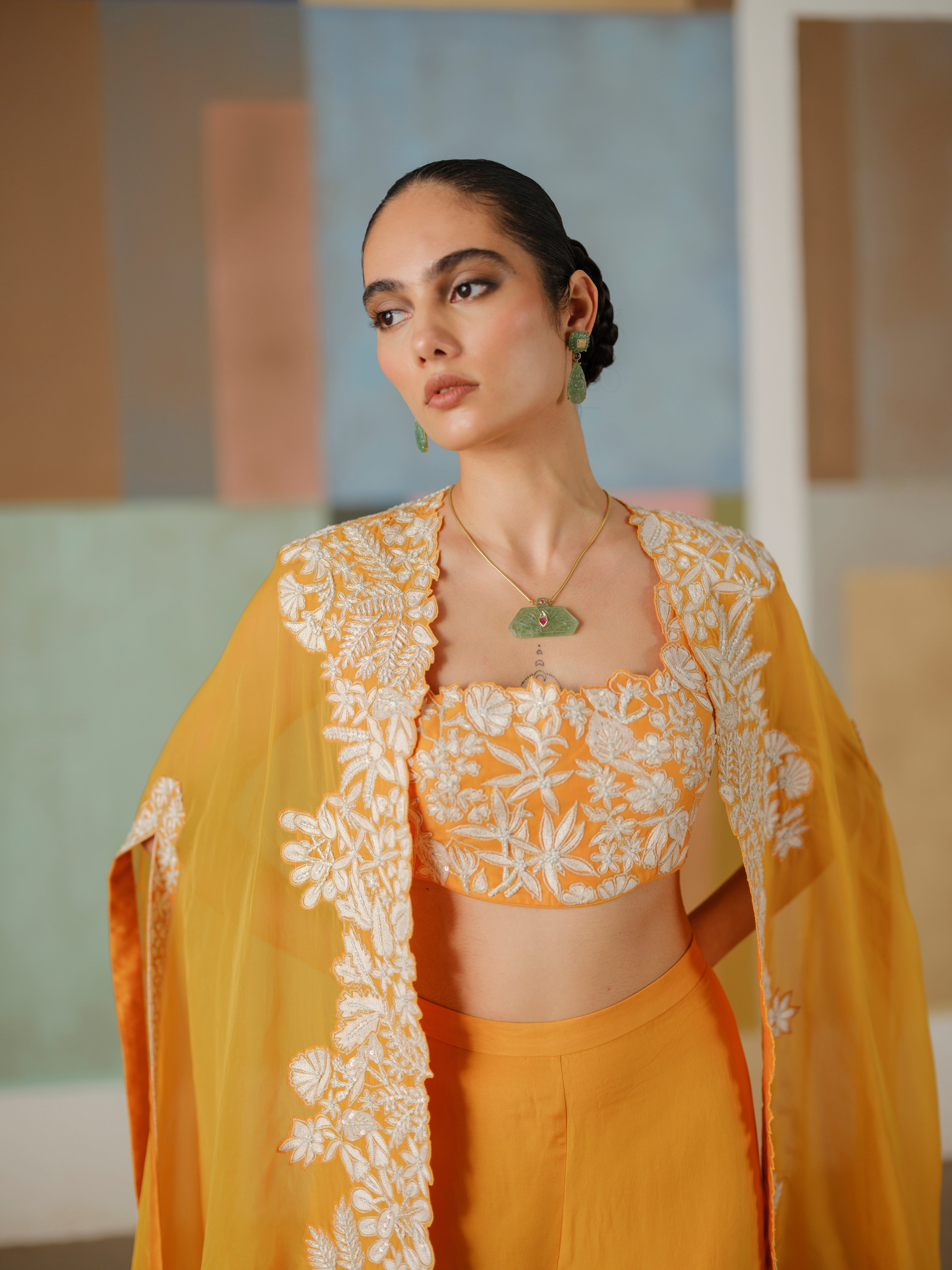 CONTRAST ASSORTED LEAVES AND WILD FLOWER BORDER CAPE WITH WILD FLOWER BUSTIER AND PANTS